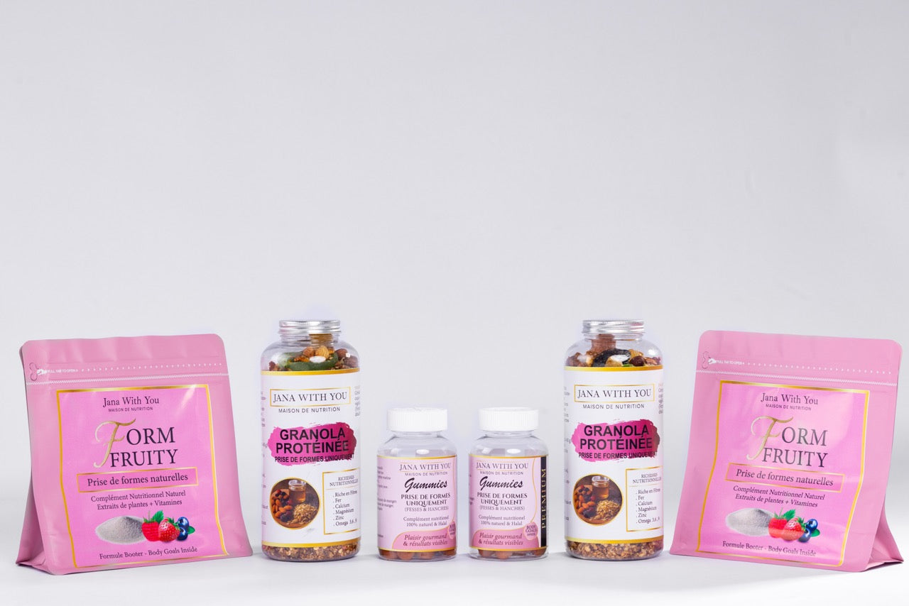 Développez vos fessiers, cuisses et hanches naturellement avec ce pack sans prise de poids . Il combine granola gourmand, la poudre de fruits naturels Form Fruity et des gummies.