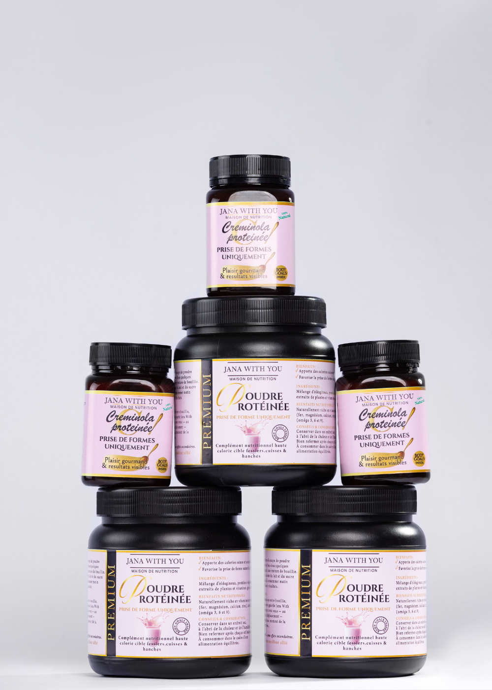 Association de pâtes gourmande (Crèminola) et de complément nutritionnel haute calorie (Poudre protéinée), conçue pour accompagner le développement naturel des fessiers, cuisses et hanches, sans prise de poids.